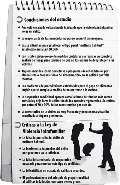 No se trató simplemente de un cambio de página en el Código Penal. La aplicación de la ley resultó compleja para defensores, fiscales, jueces de Garantía, de Familia y de Tribunales Orales. Así lo señala el estudio "La Defensa de Casos de Violencia Intrafamiliar bajo la Ley 20.066", que fue encargado por la Defensoría Nacional al Centro de Investigaciones Jurídicas de la Universidad Diego Portales, donde los operadores de la justicia no evaluaron bien la ley (Ver infografía al final de la nota).